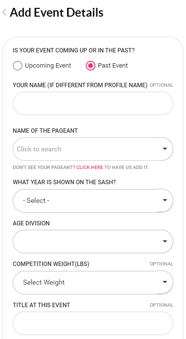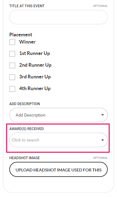 4. Type in the pageant where you competed, then select the year the pageant took place. Select your age division, and then select either select either Winner, 1st RU or 2nd RU and if applicable type in the title/awards you won for the pageant.